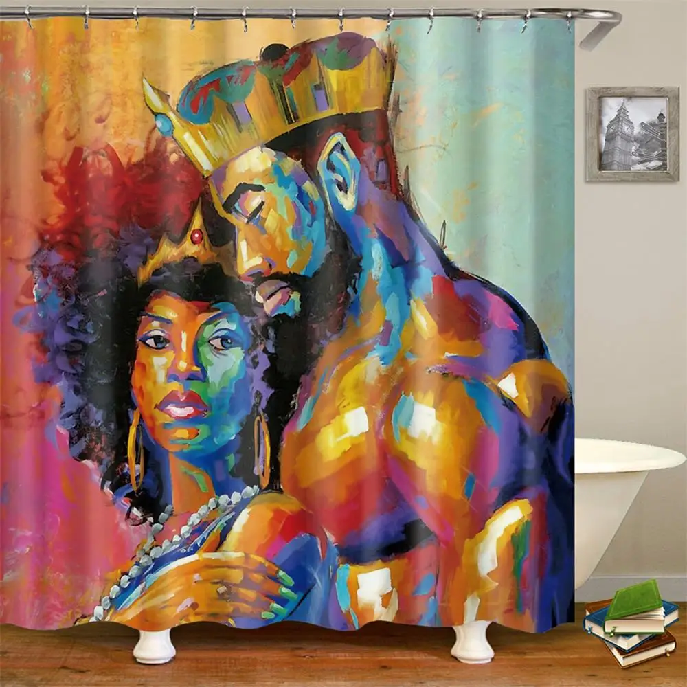 شراءمعلومات اضافية الملك افريقى عشاق زوجين دش الستائر اللوحة الفن حمام ستارة مبطنة للماء البوليستر الحمام مع السنانير